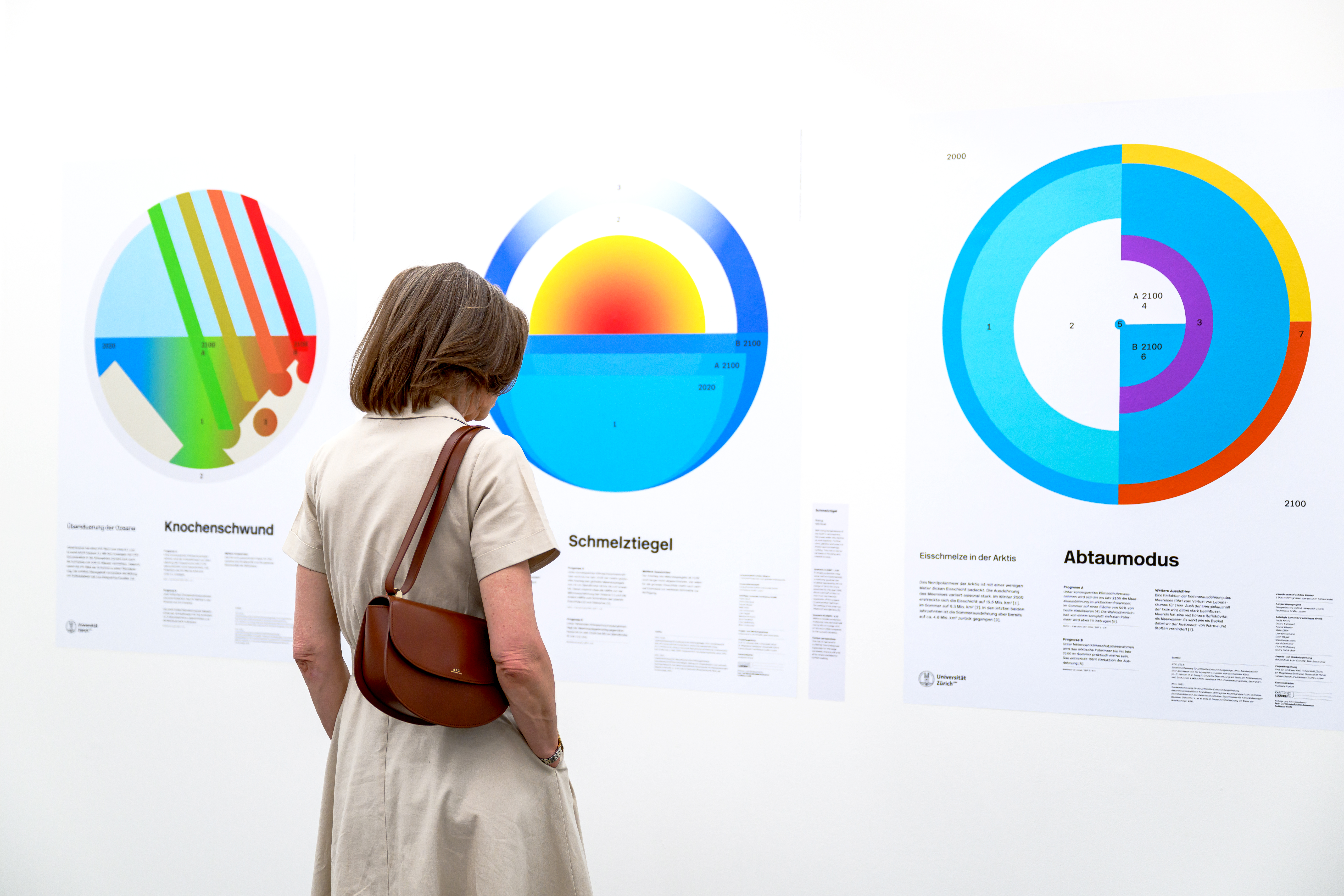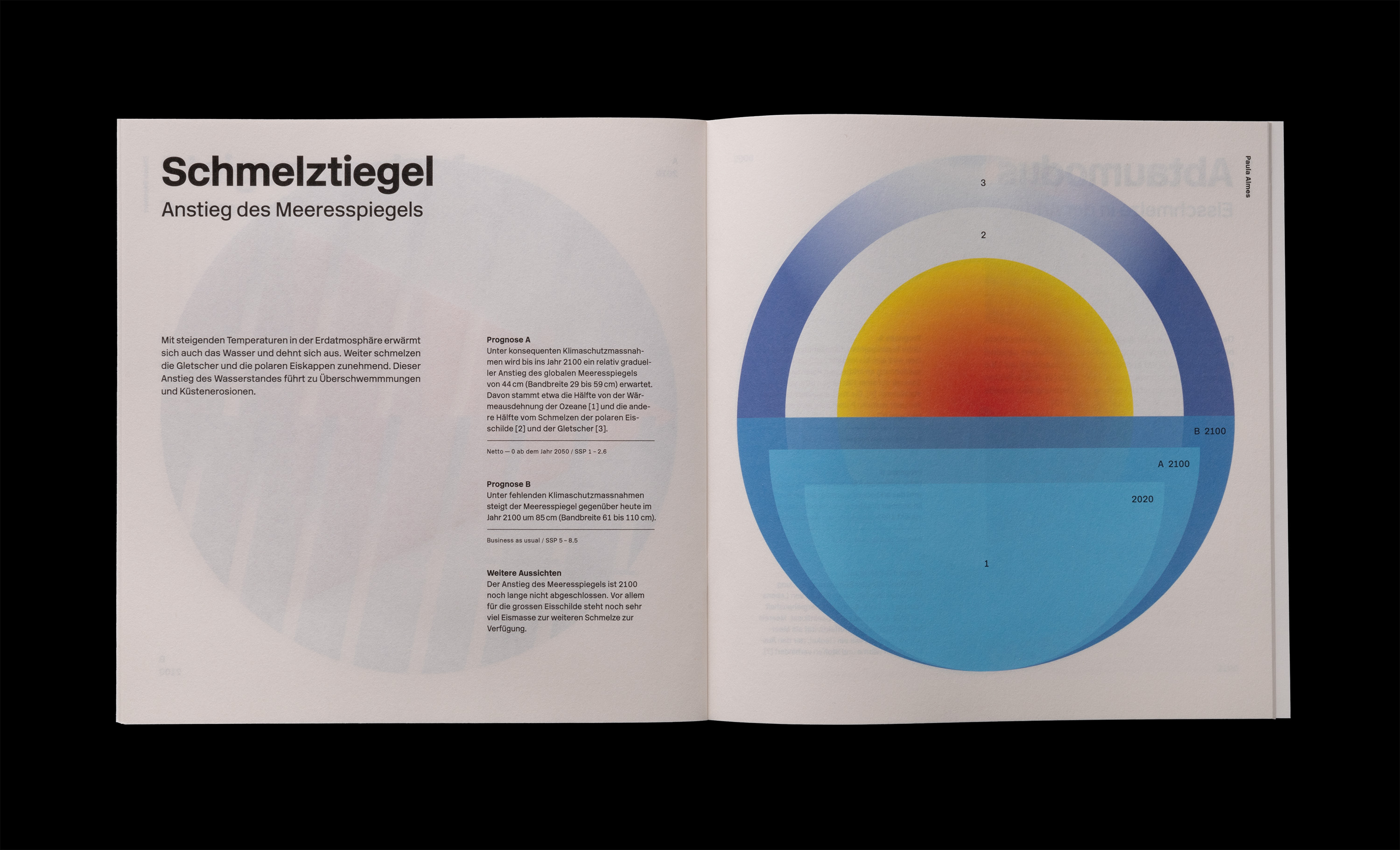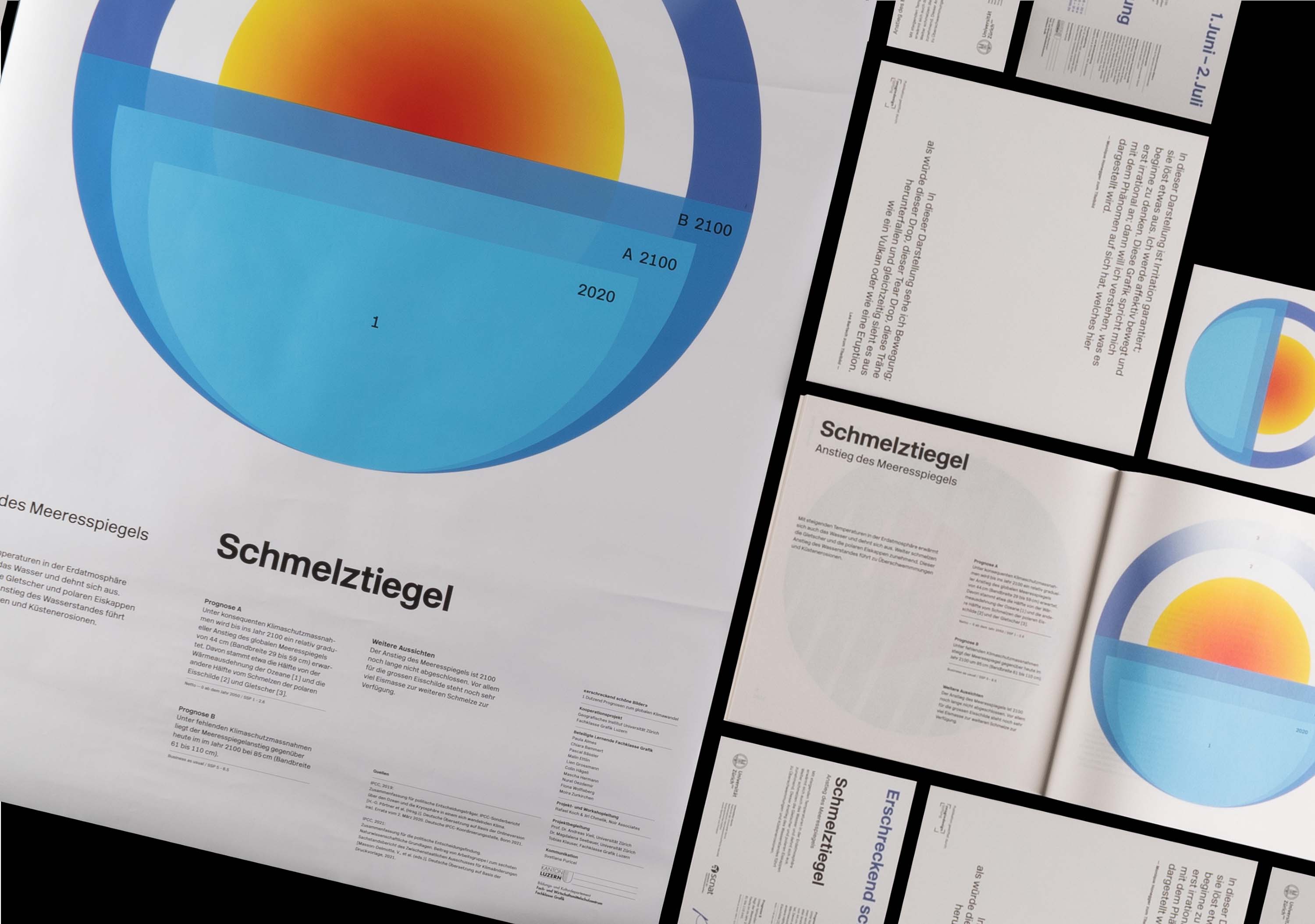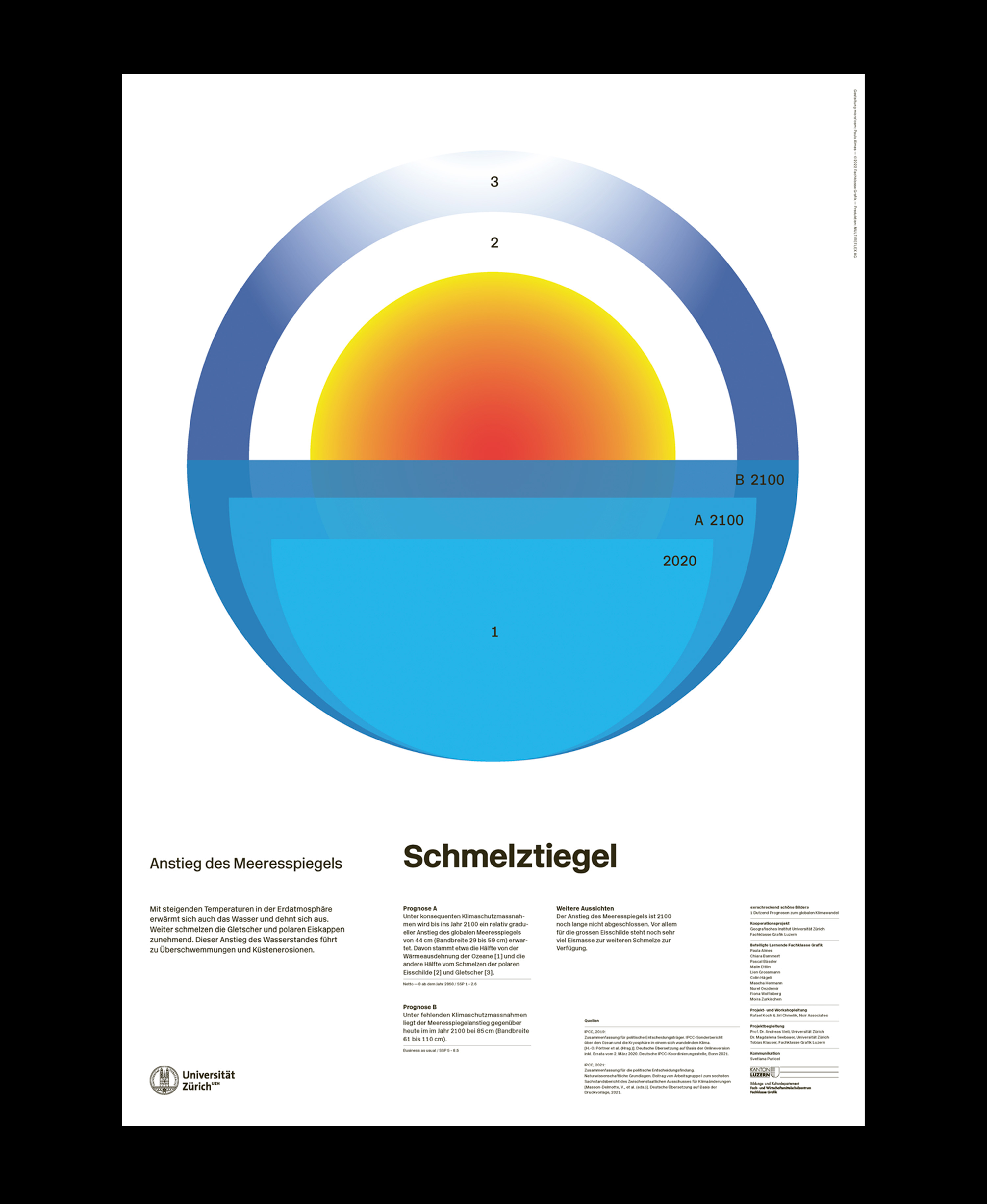 In Zusammenarbeit mit dem Geografischen Institut der Universität Zürich und der Fachklasse Grafik Luzern, haben wir als Klasse abstrakte Diagramme erstellt, die Prognosen zum Klimawandel veranschaulichen. Angesichts der meist komplexen und präzisen Klimadiagramme in wissenschaftlichen Berichten lag unser Fokus darauf, Diagramme zu erstellen, die für die Öffentlichkeit anschaulich und leicht zugänglich sind. Ich habe mich mit dem Meeresspiegelanstieg auseinandergesetzt und gezeigt, wie die Erderwärmung und das Gletscherschmelzen zusammenwirken und letztendlich dessen Anstieg verursachen.